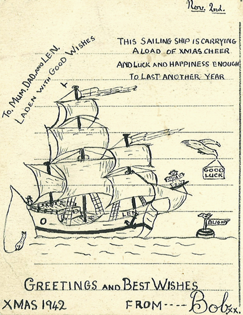 This Christmas postcard, sent from Camp 59 by Robert Dickinson to his parents and young brother Len, reads: