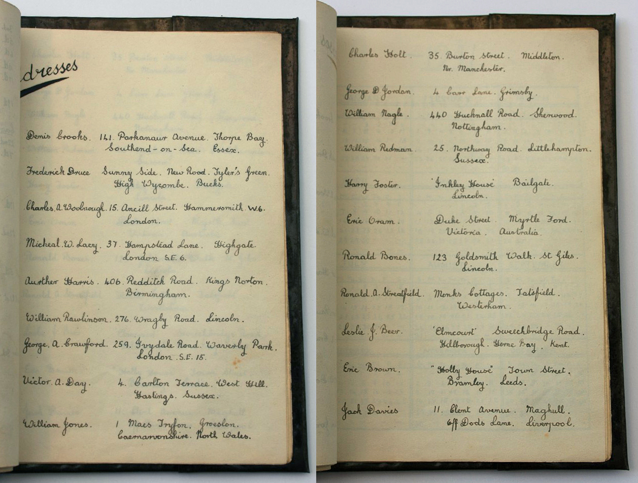 Two pages of Robert Dickinson’s journal, “Servigliano Calling,” contain names and addresses of 20 fellow prisoners. These are listed here:
