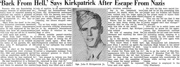 “Back from hell” would be a more appropriate phraseology, the soldier intimated as he relaxed at the home of his parents, Mr. and Mrs. John F. Kirkpatrick of 322 Lincoln St.
