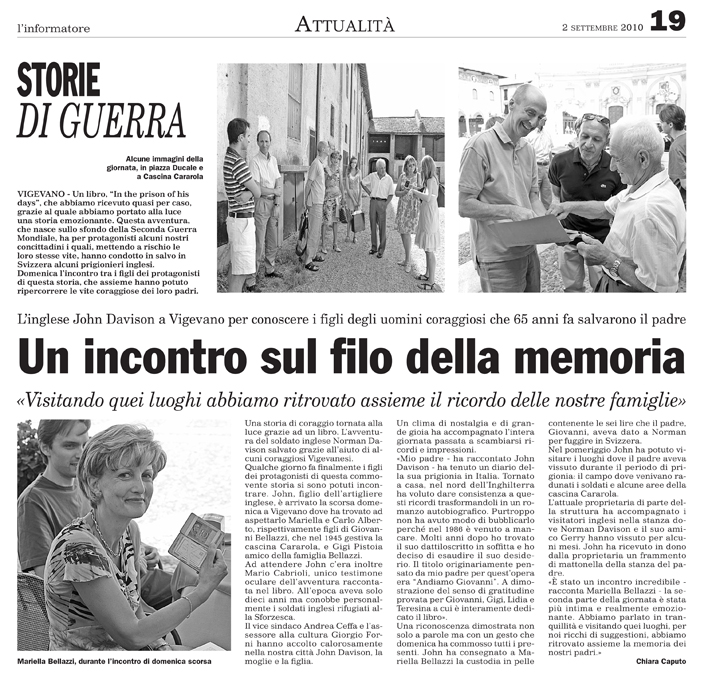 Vigevano—A book, In the Prison of His Days, came to us unexpectedly, but thanks to this chance occurance we have uncovered an exciting story. This adventure, set against the backdrop of World War II, stars some of our fellow citizens who, risking their own lives, led English prisoners to safety in Switzerland. On Sunday, sons of the characters in this story met and together traced the courageous lives of their fathers.
