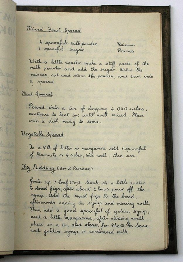 Grate up 1 loaf (7 oz.). Soak in a little water 6 dried figs, after about 2 hours pour off the syrup. Add the moist figs to the bread, afterwards adding the syrup and mincing well. Then add a good spoonful of golden syrup and a little margarine, after mixing well place in a tin and steam for ½ hr. to 1 hr. Serve with golden syrup or condensed milk.