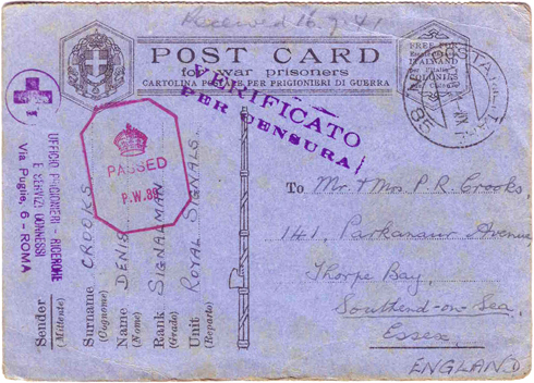 “I am alright (I have not been wounded). I am a prisoner of the Italians and I am being treated well. Shortly I shall be transferred to a prisoner’s camp and I will let you have my new address. Only then I will be able to receive letters from you and to reply.”