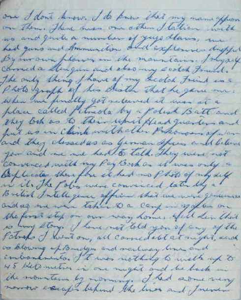 Well, Sir, that is my story. I have not told you of any of the patrols I went on, all carried out at night such as blowing up bridges and railway lines and embankments. It was nothing to walk up to 45 kilometres in one night and be back in the mountains by morning. I had some very narrow escapes behind the lines and I never want to go through it again. The Scotch man and I and the Lieutenant Lucio were caught in an open field on one occasion when we ventured out in the daytime.