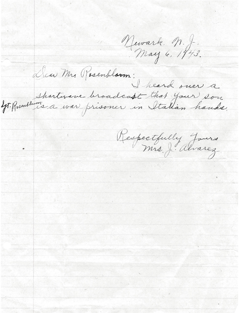 Tonight over the enemy radio, I picked up a broadcast informing any American listeners of Americans who are prisoners of war in Italy. Your son, Sergeant Alfred Rosenbloom, was one. Since the announcer talked extremely fast, I was unable to get the serial number. If I can be of any further service to you, just drop me a line. Until then, I remain your faithful servant,