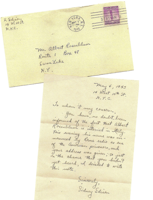You have, no doubt, been informed of the fact that Albert Rosenblum is interned in Italy. This evening his name was announced by Rome radio as one of the American prisoner, and your address was given; so just on the chance that you hadn’t yet heard, I decided to write this note.