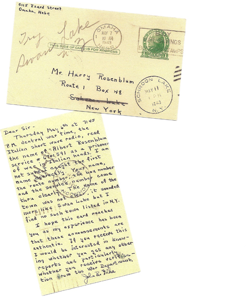 Thursday May 6th at 7:45 P.M. central war time, the Italian short wave radio, read the name of Albert Rosenblum service #6701591 as a prisoner of war in Italian hands. I am not sure I caught the first name correctly. Your name, the route number, the box number, and the service number came through clearly. The name of the town was not clear, it sounded more like Swan Lake but I find no such town listed in N.Y.