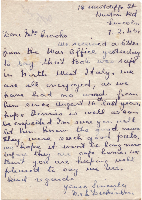 The following two letters were sent from Robert Dickinson’s stepmother to Denis Crooks’ mother when the two sons were overseas during the war.