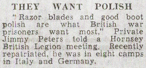 “Razor blades and good boot polish are what British war prisoners want most,” Private Jimmy Peters told a Hornsey British Legion meeting. Recently repatriated, he was in eight camps in Italy and Germany.