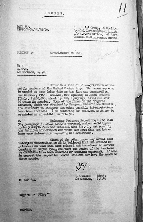 Check of the other names may reveal some relevant information as it is believed that the British ex-prisoners in this case were exhumed and transferred to another cemetery in August 1944, and that the bodies of the Americans at COMUNANZA have been searched by American personnel. If this is correct the respective Second Echelons may have the names of these people.