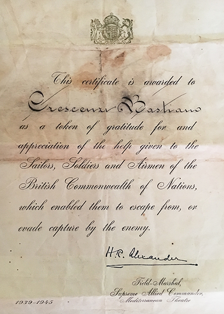 This certificate is awarded to Crescenzi Bastiano as a token of gratitude for and appreciation of the help given to the Sailors, Soldiers and Airmen of the British Commonwealth of Nations, which enabled them to escape from, or evade capture by the enemy.