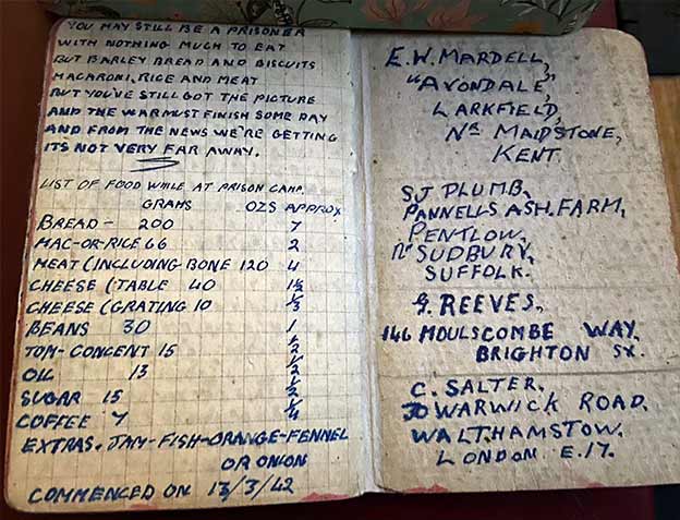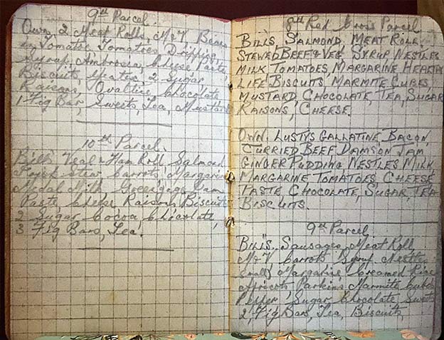 On several pages of Reginald’s notebook he lists contents of Red Cross parcels he and a fellow named Bill received. “My grandad never spoke of ‘Bill’ to anyone,” Hannah told me, “but it would seem from reading his notebook that he was a close friend, presumably from the camp.”