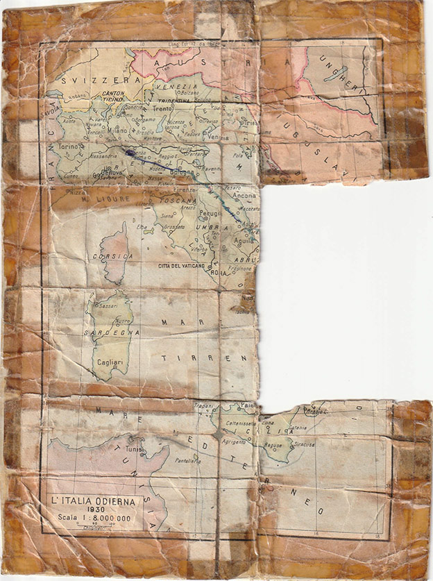 It transpired that the two soldiers, Enrico and Giovanni, were also heading south—one to San Marino and the other to Foggia. At Alf’s request, Marianna negotiated with the soldiers. It was agreed that they would walk south with Alf. Albina tore a map of Italy out of her schoolbook to help them on their journey. Alf shared his escape rations with the two soldiers and together they began the long walk south. They walked about ten to fifteen miles each morning, with the two Italians doing the talking whilst Alf pretended to be a mute. Fortunately, Alf was dark-haired and very sun-tanned after having spent two years in North Africa and a further two in Italy. In his farmer’s clothes and civilian shoes he looked the part.