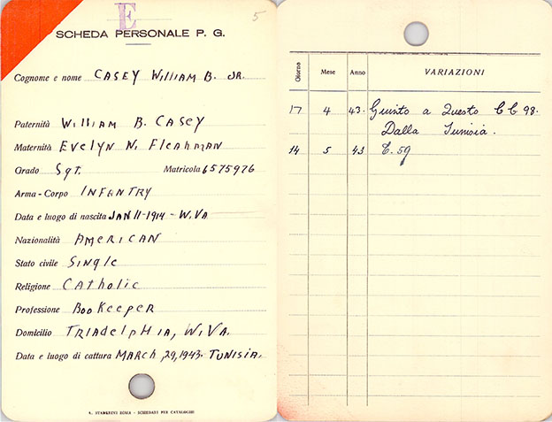 Although I don’t have a repatriation report for William B. Casey Jr., from POW records from the U.S. National Archives we do know that he was repatriated in Italy on 25 June 1943. The last camp he was in was P.G. 59.