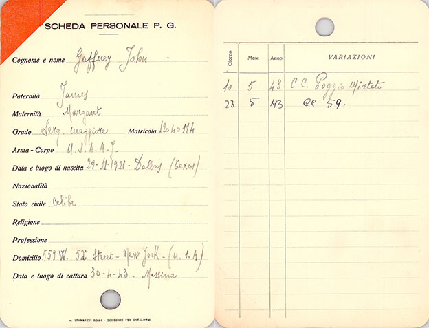 While on a mission, American airmen John Gaffney and Albert Romero’s B-24 bomber was shot down over the sea near Messina, Italy, on 30 April 1943. The only two survivors, they were interned in P.G. 59. Both escaped on the night of the 14 September 1943 mass breakout. Although John Gaffney paired up with Sgt. William Casey and Albert Romero traveled alone, they all headed south for the Allied lines, arriving a couple of days apart in late October.