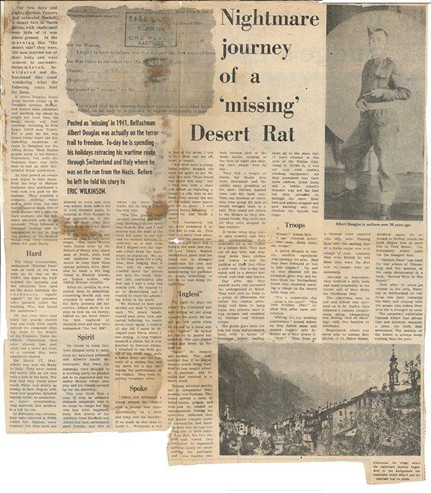 Posted as ‘missing’ in 1941, Belfastman Albert Douglas was actually on the terror trail to freedom. To-day he is spending his holidays retracing his wartime route through Switzerland and Italy where he was on the run from the Nazis. Before he left he told his story to ERIC WILKINSON.