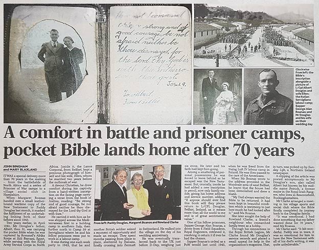 The returned POW Bible story made headlines in both England and Northern Ireland. (See also “Bible Returned to Family after 70 Years.”)