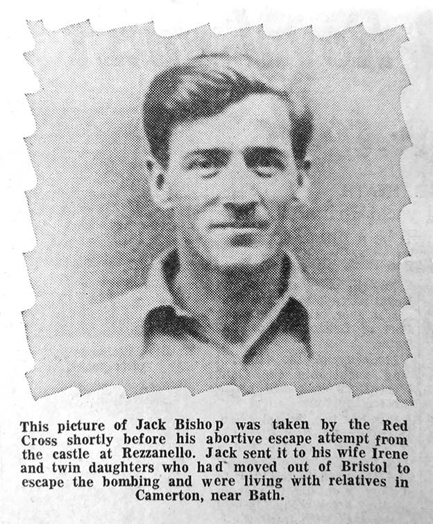 Caption: This picture of Jack Bishop was taken by the Red Cross shortly before his abortive escape attempt from the castle Rezzanello. Jack sent it to his wife Irene and twin daughters who had moved out of Bristol to escape the bombing and were living with relatives in Camerton, near Bath.