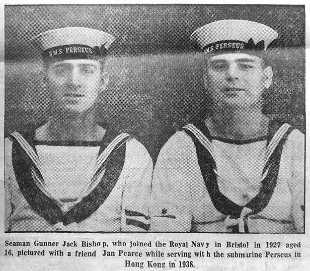 Caption: Seaman Gunner Jack Bishop, who joined the Royal Navy in Bristol in 1927 aged 16, pictured with a friend Jan Pearce while serving with the submarine Perseus in Hong Kong in 1938.