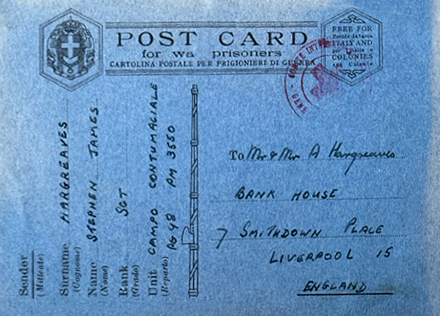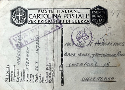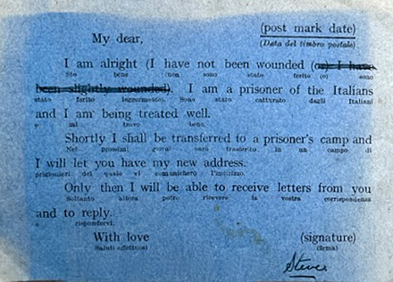 “I am alright (I have not been wounded). I am a prisoner of the Italians and I am being treated well. “Shortly I shall be transferred to a prisoner’s camp and I will let you have my new address. “Only then I will be able to receive letters from you and to reply.” “With love Steve”