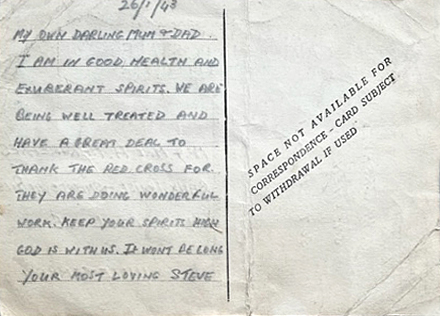 26/1/43 My own darling Mum & Dad I am in good health and exuberant spirits. We are being well treated and have a great deal to thank the Red Cross for. They are doing wonderful work. Keep your spirits high. God is with us. It won't be long. Your most loving Steve