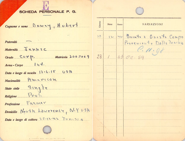 POW cards for Brayno Reome and Hubert Dewey kept by the Italians during their internments