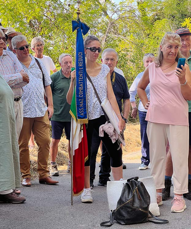 Lunch was immediately followed by a bus/car caravan to Montelparo, where attenders rendezvoused with ELMS walkers at a plaque dedicated to Sidney Seymour Smith, who was killed in March 1944 at that very location.