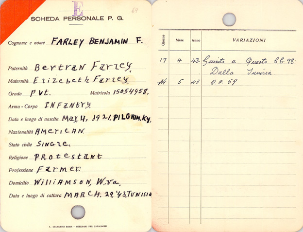 Ben had a grammar school education. He was born and raised in eastern Kentucky, in the Appalachian Mountains—a beautiful area, but a tough place to grow up. Most locals earned a living in coal mining and logging. Some families had small farms. Ben’s Italian POW card lists his profession as “farmer.” His civilian employment, as designated on his enlistment papers, was “farm hands, general faming.”