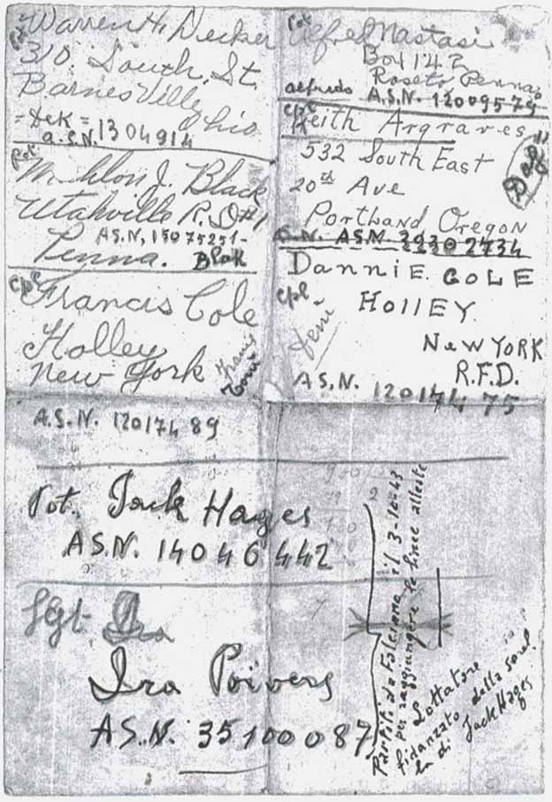 Note that although there are frequent references to six prisoners, two others—Ira Powers and Jack Hayes—also received help in Falciano. Ira and Jack left sooner than the others and succeeded in crossing the Allied lines. The other six were recaptured.