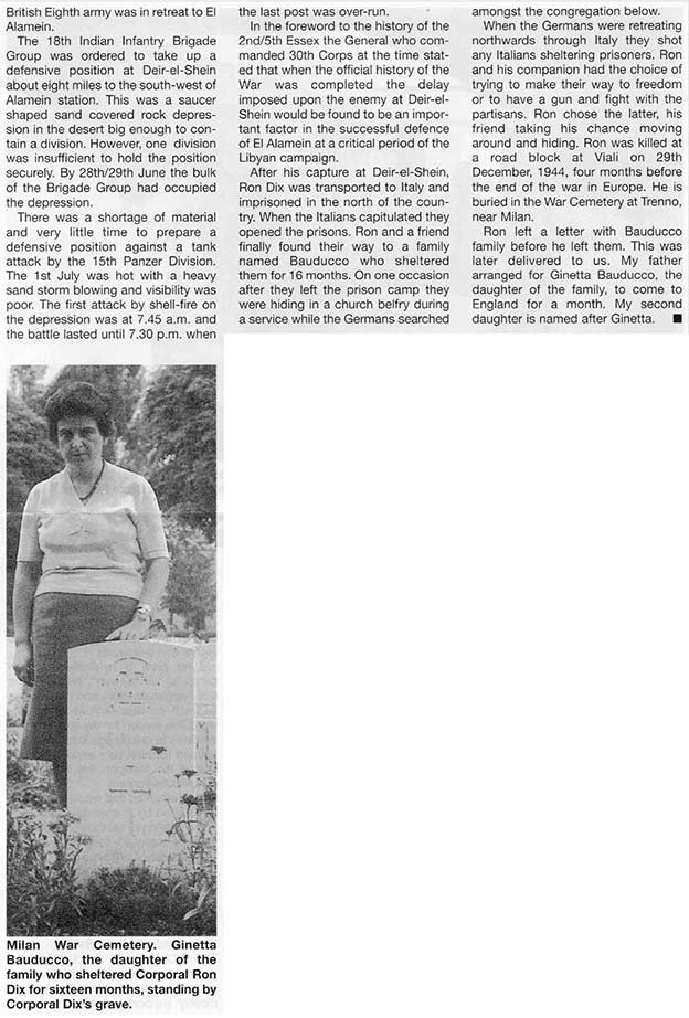 After his capture at Deir-el-Shein, Ron Dix was transported to Italy and imprisoned in the north of the country. When the Italians capitulated they opened the prisons. Ron and a friend finally found their way to a family named Bauducco who sheltered them for 16 months on one occasion after they left the prison camp they were hiding in a church belfry during a service while the Germans searched amongst the congregation below.