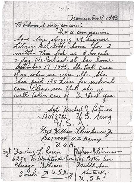 The four escaped POWs—all from PG 59—were named in a chit written by Micheal. The chit specifies the POWs arrived at Letizia’s home on 17 September 1943—just three days after the camp breakout. Sergeant Irving L. Rosen and Staff Sergeant Ivan J. Robinson stayed with Letizia for only a few weeks.