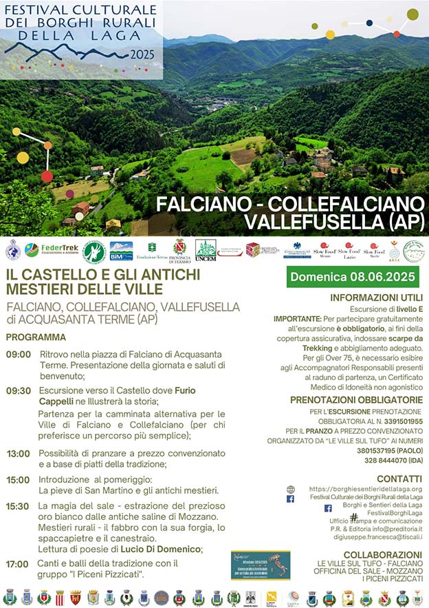 Activities will include an hike to the foundation of a medieval castle once situated on a cliff above Falciano; walks through the villas of Falciano and Collefalciano, a talk about “the magic of salt—extraction of this precious white gold from the ancient salt mines of Mozzano”; demonstrations of rural professions, including those of the blacksmith with his forge, the stone-breaker, and the basket maker; a reading of poems by Lucio Di Domenico; and traditional songs and dances performed by the group I Piceni Pizzicati.