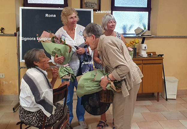 We received a cordial welcome in the community centre, with soft drinks for all and flowers for Rona, Jeannie, and me. Prof. Zucca gave a presentation describing our joint interest in prisoners of war, and I explained that we were looking for Luigi Moscara. At this a chorus of voices exclaimed in unison that a certain well-known character, Luigi Massara, more commonly known by the nickname ‘Mosca’, was likely to be the person we were interested in. He had been living at Casoni de’ Peri during the war.