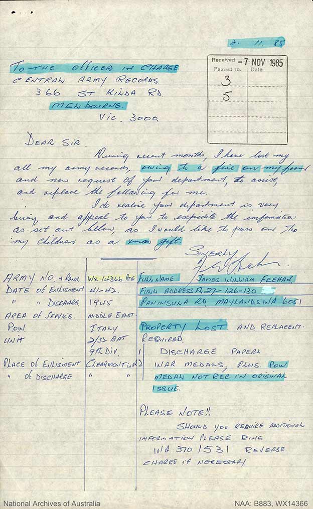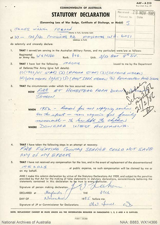 In November 1985, Jimmy wrote to the Central Army Records Office in Melbourne to request a copy of his military service record and replacement of lost medals. There had been the fire at his homestead farm during the drought season, he explained, and his paperwork and medals were destroyed.