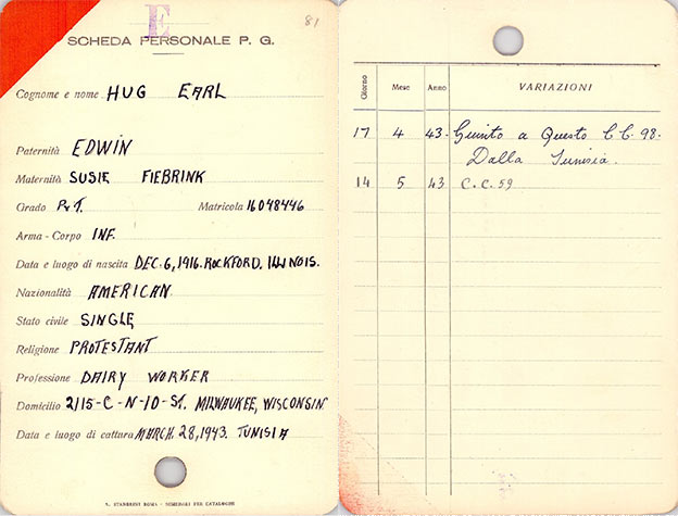 Earl’s POW identity card at NARA indicates he was captured 28 March 1943 in Tunisia. He was interned in PG 98 on Sicily beginning on 17 April, from which he was transferred to PG 59, arriving on May 14. Presumably he escaped during the mass breakout from the camp on 14 September 1943.