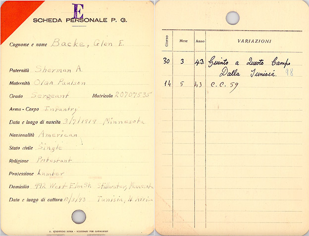 On further checking, I discovered Sgt. G. E. Backe appears on an Allied Screening Commission list of U.S. Escapers and Evaders (Record Group 331, NARA) as having been recaptured on 10 March 1943. (Thanks to researcher Cristiano D’Adamo for my access to this resource.)