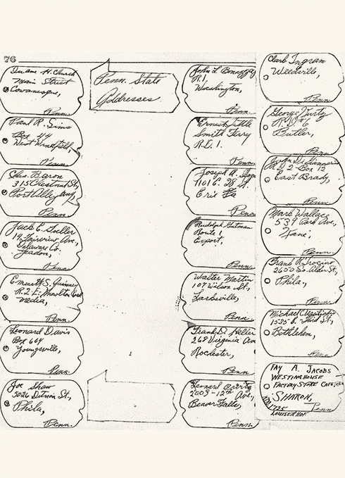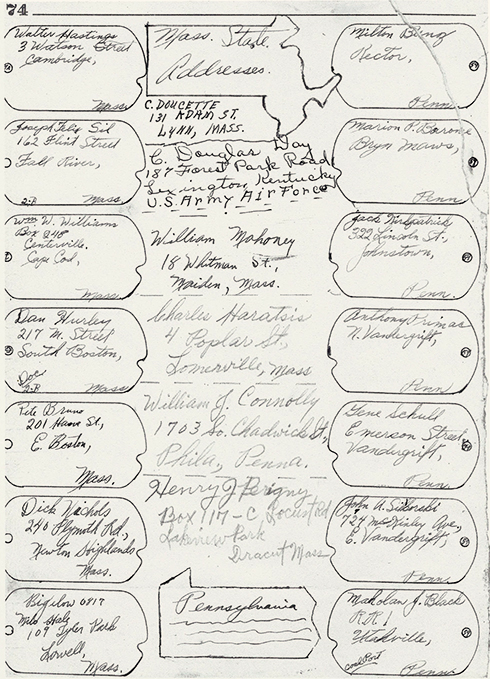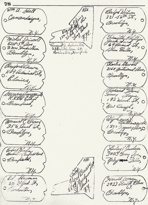 Roughly half of the addresses are written within the shapes of dog tags, and the traced holes of several of the tags cleverly contain camp numbers or crosses that likely indicate medical or pastoral affiliation.